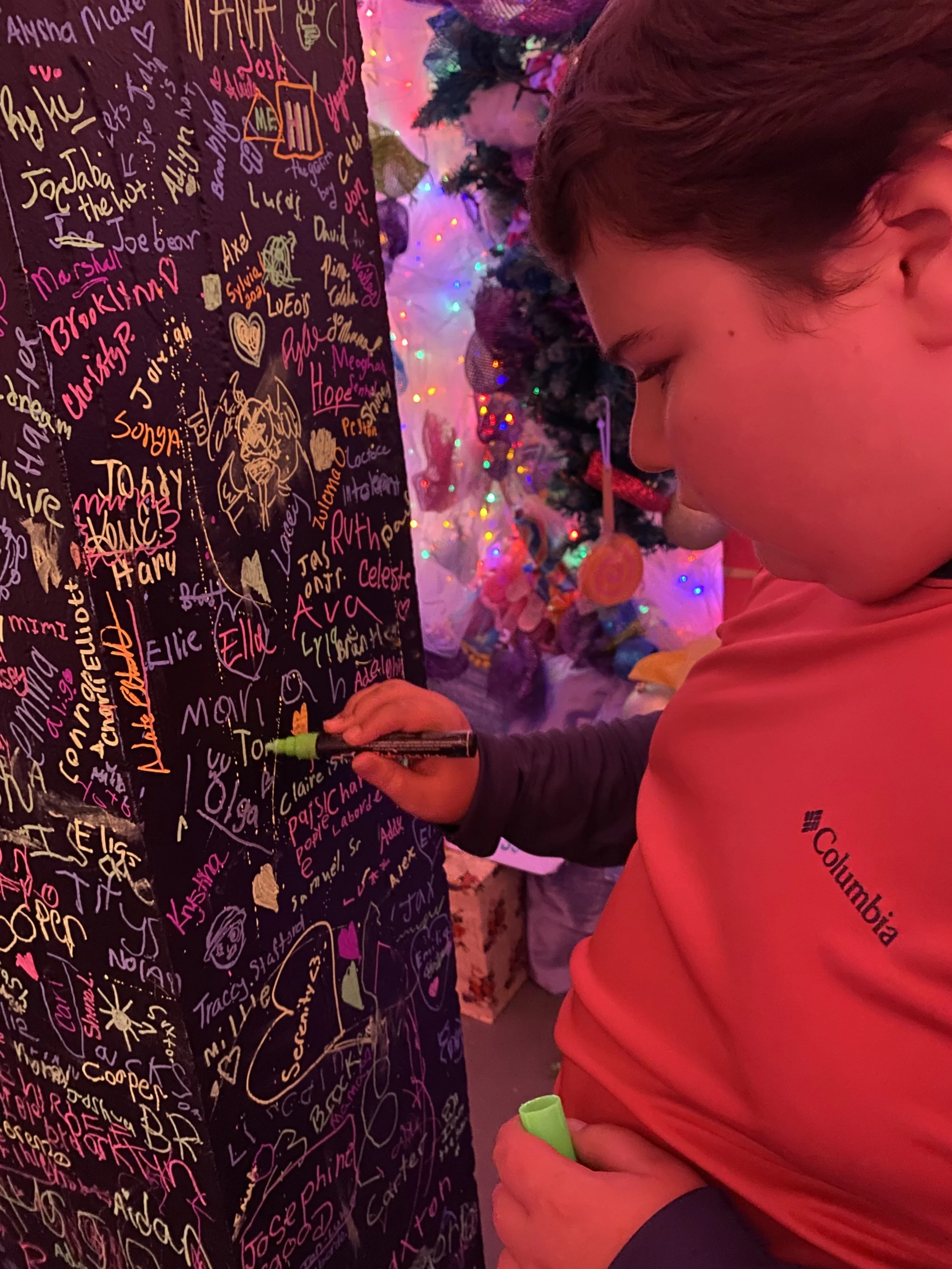 Unsure how scary it would be and how Tommy would react, we did give them a heads up to ease into the visit… As you can guess, Tommy did so well and just went with the flow. He seemed to enjoy seeing the Grinch, even though he did not get his humor!! He made a good Grinch! Also, upstairs was a post office where you could write a letter to Santa! He also added his name to the “naughty” list – entirely by accident of course!